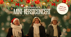 No Romeo’s heeft ook deze kerst weer een leuke actie. Want ondanks dat het nog herfst is, zijn we al bezig met de voorbereidingen voor de mooiste tijd van het jaar. No Romeo’s is dol op kerst! De afgelopen jaren hebben we al vele mini-kerstconcerten mogen geven tijdens kerstborrels, kerstdiners, en in verzorgingshuizen. Ben je op zoek naar de ultieme kerstsfeer? Boek voor slechts €150,- een miniconcert met zangeressen van No Romeo’s. Wij zingen bij jou thuis of op je werk de sterren van de hemel! Mail naar info@noromeos.nl en laat ons weten waar en wanneer je ons graag wilt horen zingen. Merry X-mas!